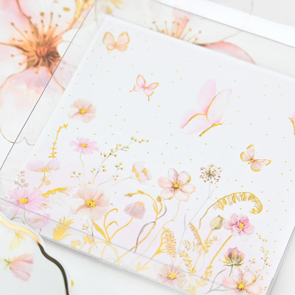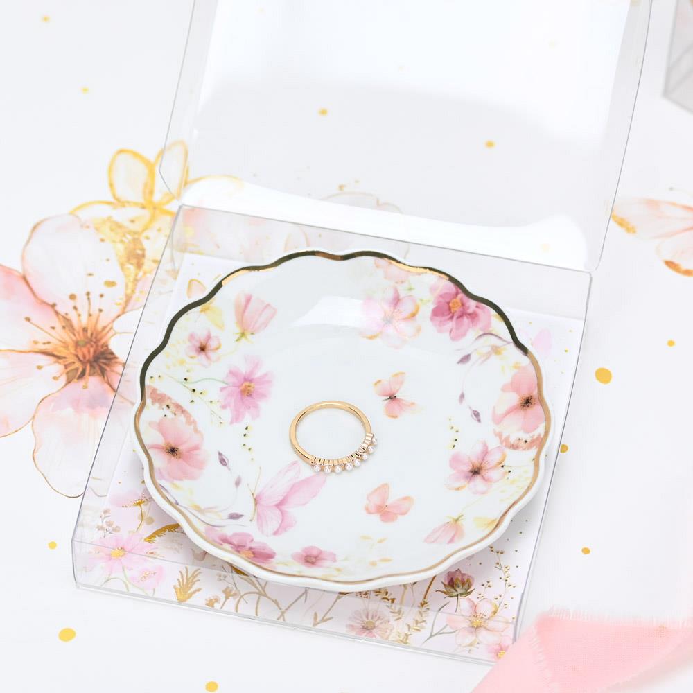 Πορσελάνινο πιατάκι κοσμημάτων με χρυσό τελείωμα, που συνδυάζει ρομαντισμό και διακριτική πολυτέλεια.Το σχέδιο με ροζ άνθη και πεταλούδες, αναδεικνύεται από τις χρυσές λεπτομέρειες και προσδίδει μια αίσθηση κομψότητας και φινέτσας.Η συσκευασία του διάφανο κουτί με εκτυπωμένη κάρτα στο ίδιο θέμα και χρυσοτυπία, το καθιστά έτοιμο να προσφερθεί ως δώρο.Μια ιδιαίτερη πρόταση για να φιλοξενήσει τα αγαπημένα σας κοσμήματα και να χαρίσετε στους καλεσμένους σας μια μπομπονιέρα ή ένα δώρο που θα μείνει αξέχαστο.