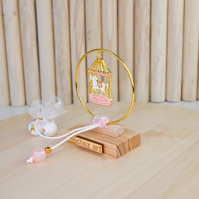 Διακοσμητικό μεταλλικό μοτίφ εκκρεμές, σε λευκές, ροζ και χρυσές αποχρώσεις, με θέμα carousel.