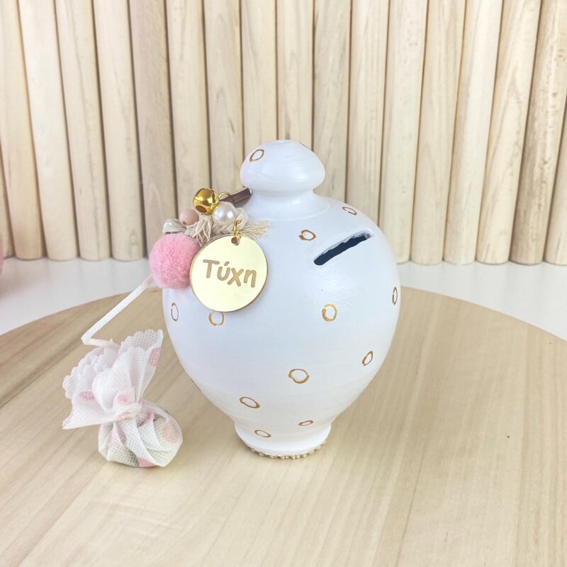 Κεραμικός κουμπαράς, σε κλασικό σχήμα και ροζ-χρυσές αποχρώσεις.