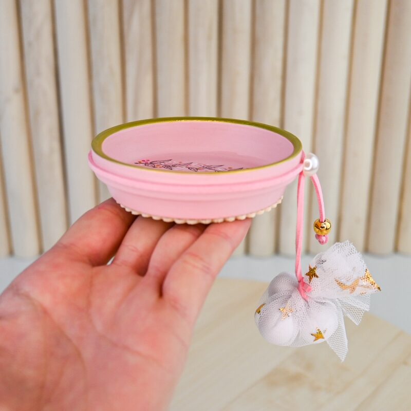Μπομπονιέρα διακοσμητικό κεραμικό πιατελίνι, σε χρυσές και ροζ αποχρώσεις.