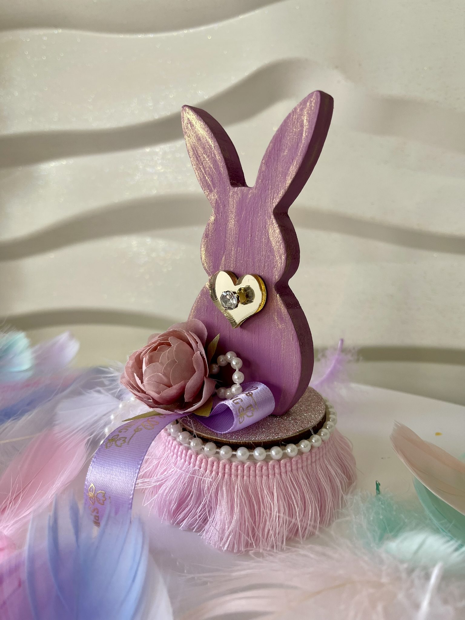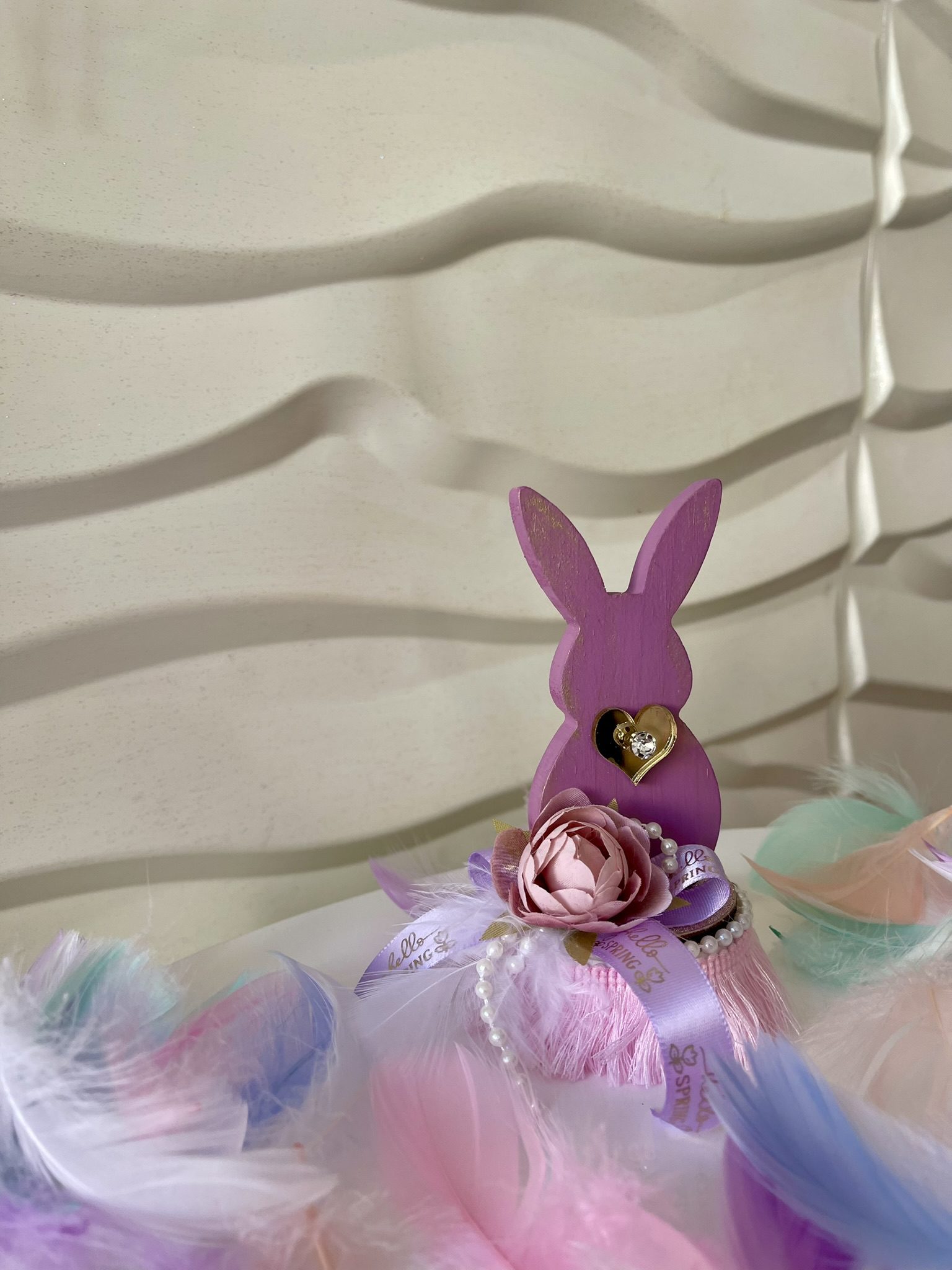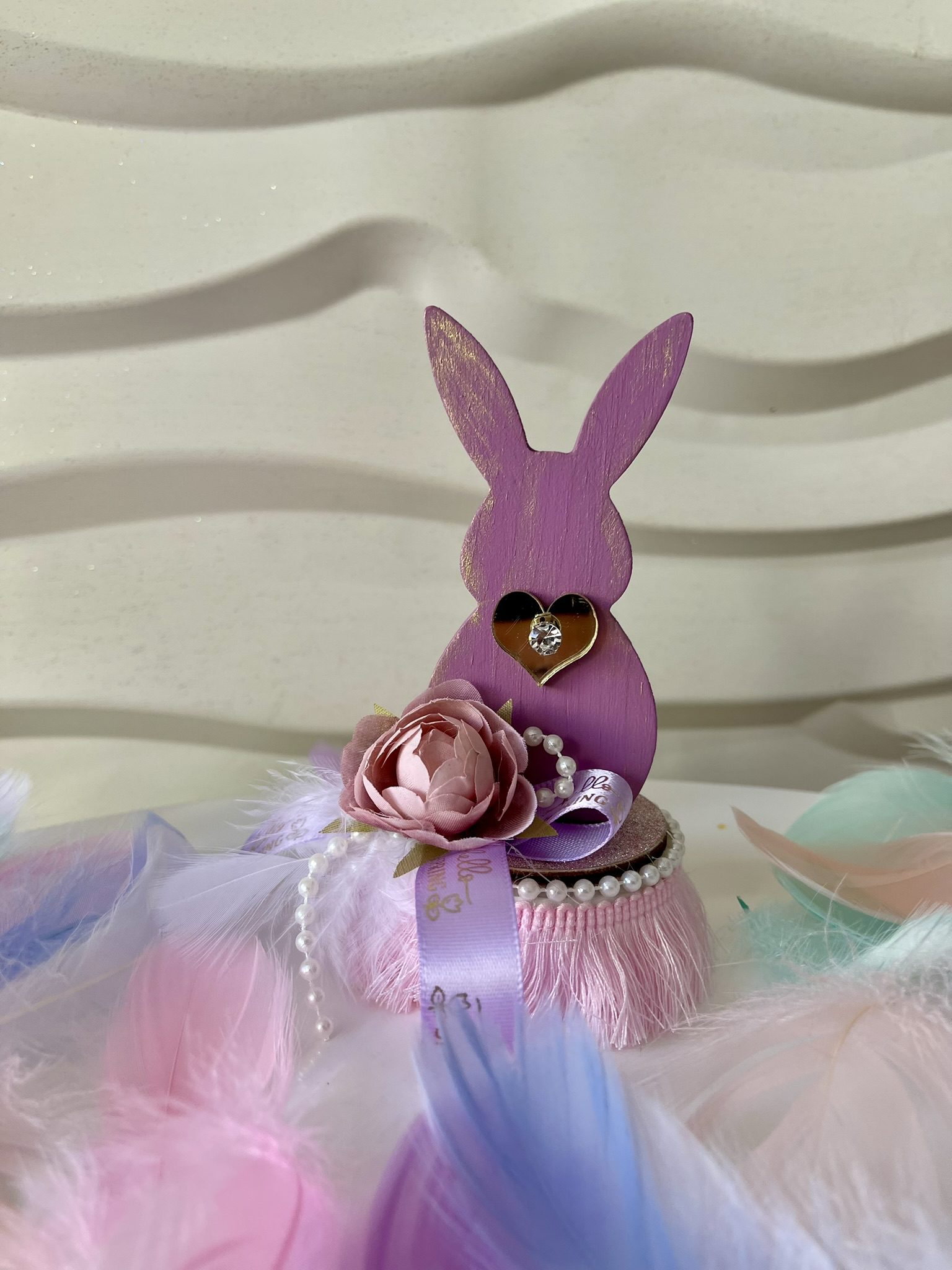 Ξύλινο διακοσμητικό ανοιξιάτικο-πασχαλινό κουνελάκι σε μωβ-ροζ πάνω σε μαρμάρινη βάση