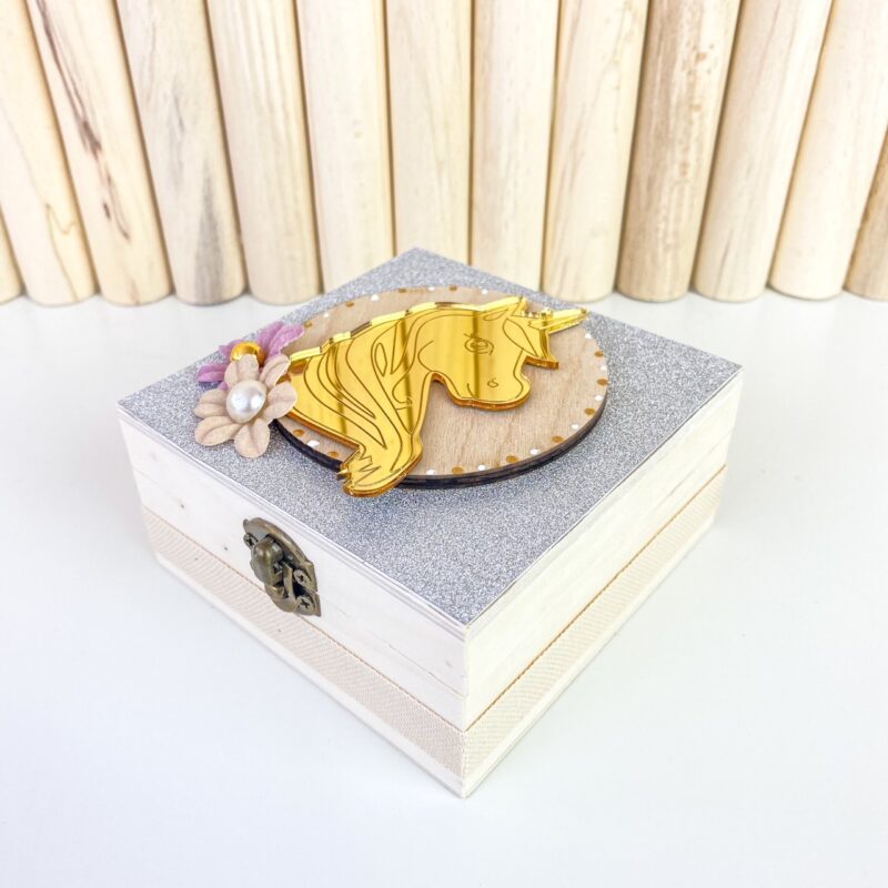 Ξύλινο κουτί σε φυσικές και ασημί αποχρώσεις με μεταλλικό κούμπωμα και plexiglass gold μοτίφ μονόκερος.