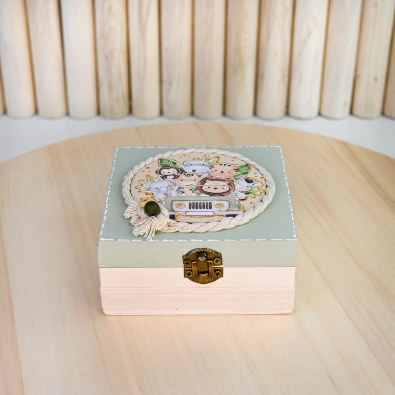 Ξύλινο κουτί σε φυσικές και φιστικί αποχρώσεις με μεταλλικό κούμπωμα και θέμα ζωάκια της ζούγκλας.