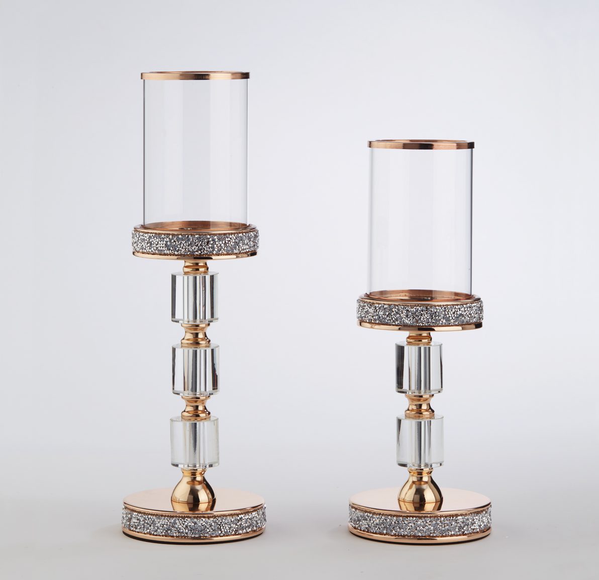 Το σετ λαμπάδων γάμου διαθέτει κρυστάλλινα κηροπήγια με χρυσές λεπτομέρειες και γυάλινο επάνω μέρος.