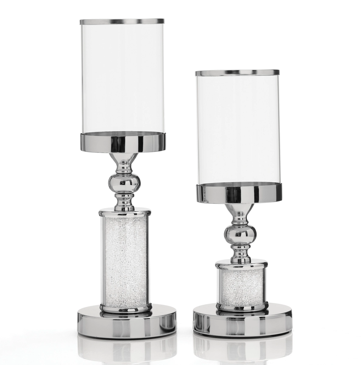 Το σετ λαμπάδων γάμου διαθέτει κρυστάλλινα κηροπήγια με ασημένιες λεπτομέρειες και γυάλινο επάνω μέρος.