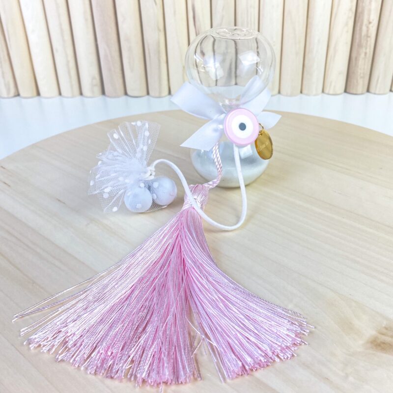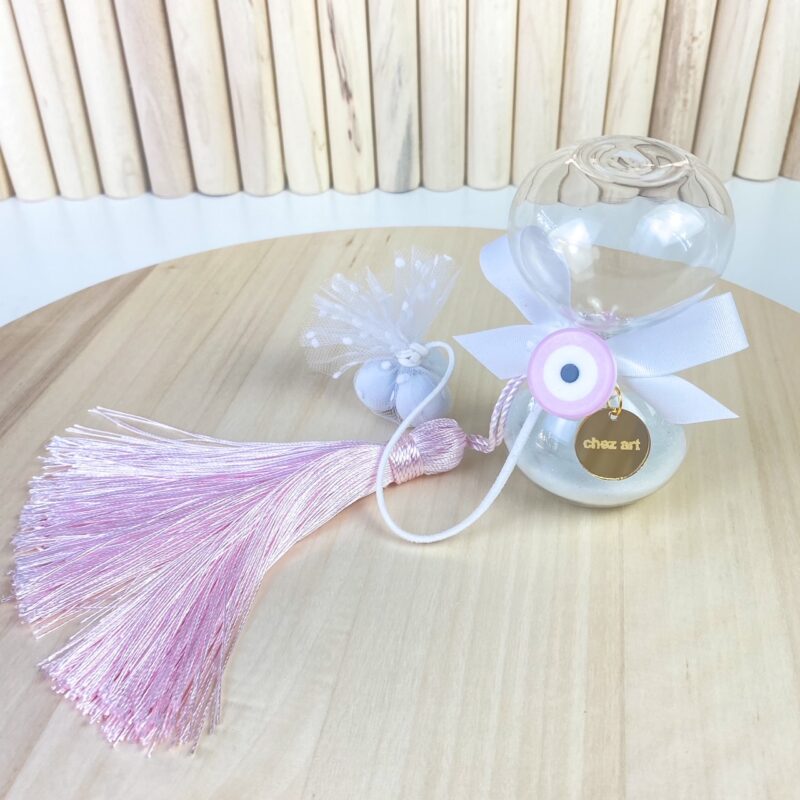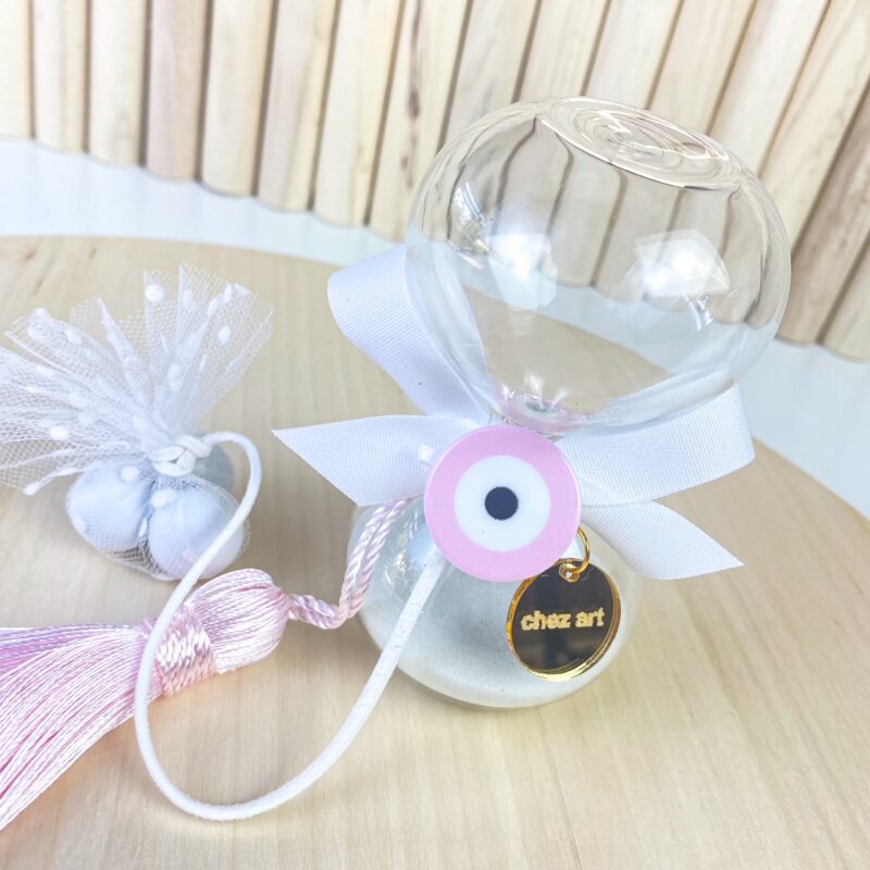 Plexiglass διάφανη κλεψύδρα με λευκή άμμο και ματάκι σε ροζ – λευκή απόχρωση.