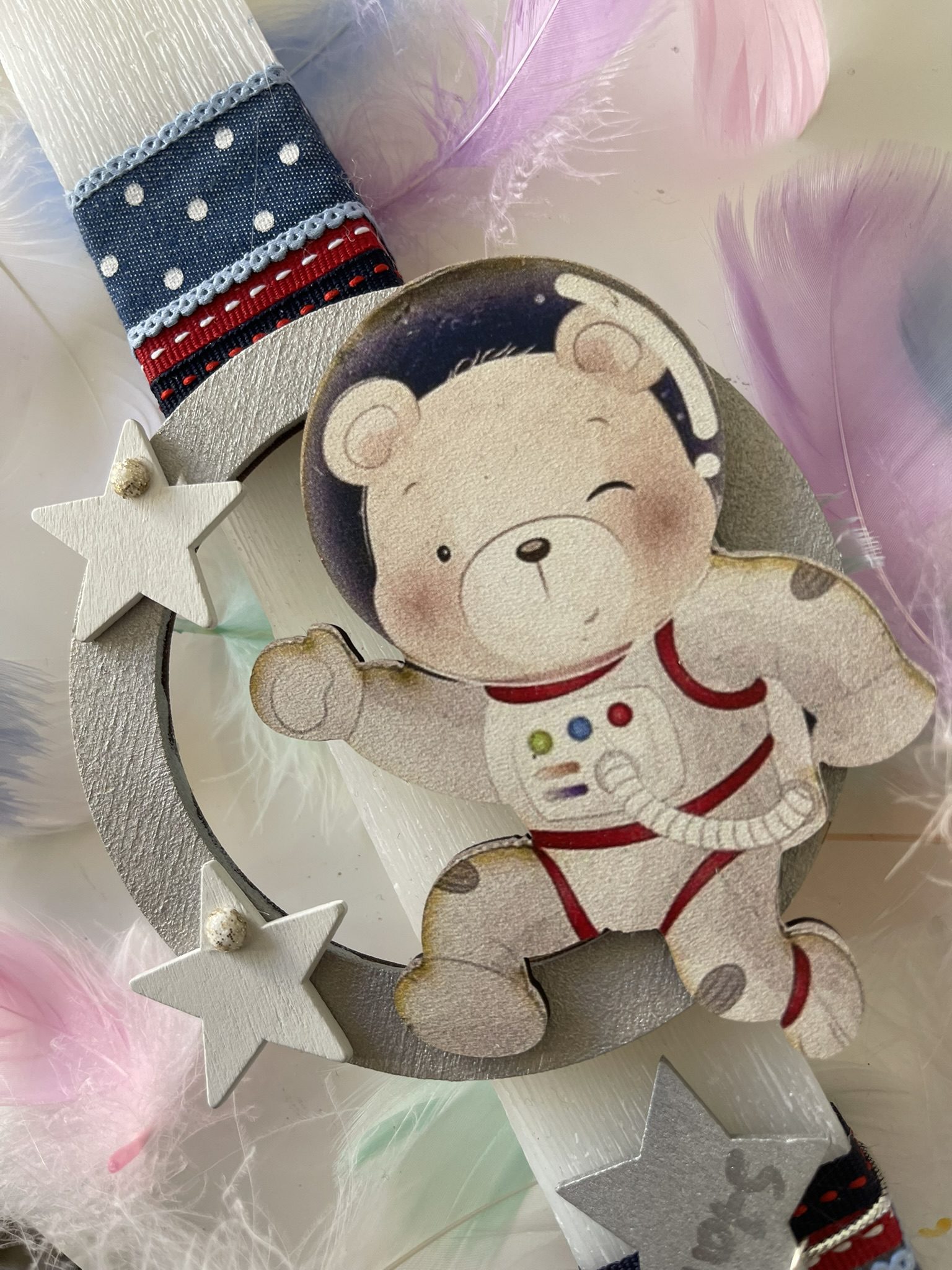 Χειροποίητη πασχαλινή αρωματική λαμπάδα με πλακέ κερί ”Αστροναύτης” σε αποχρώσεις off white ,ασημί,μπλε και ξύλινες φιγούρες .