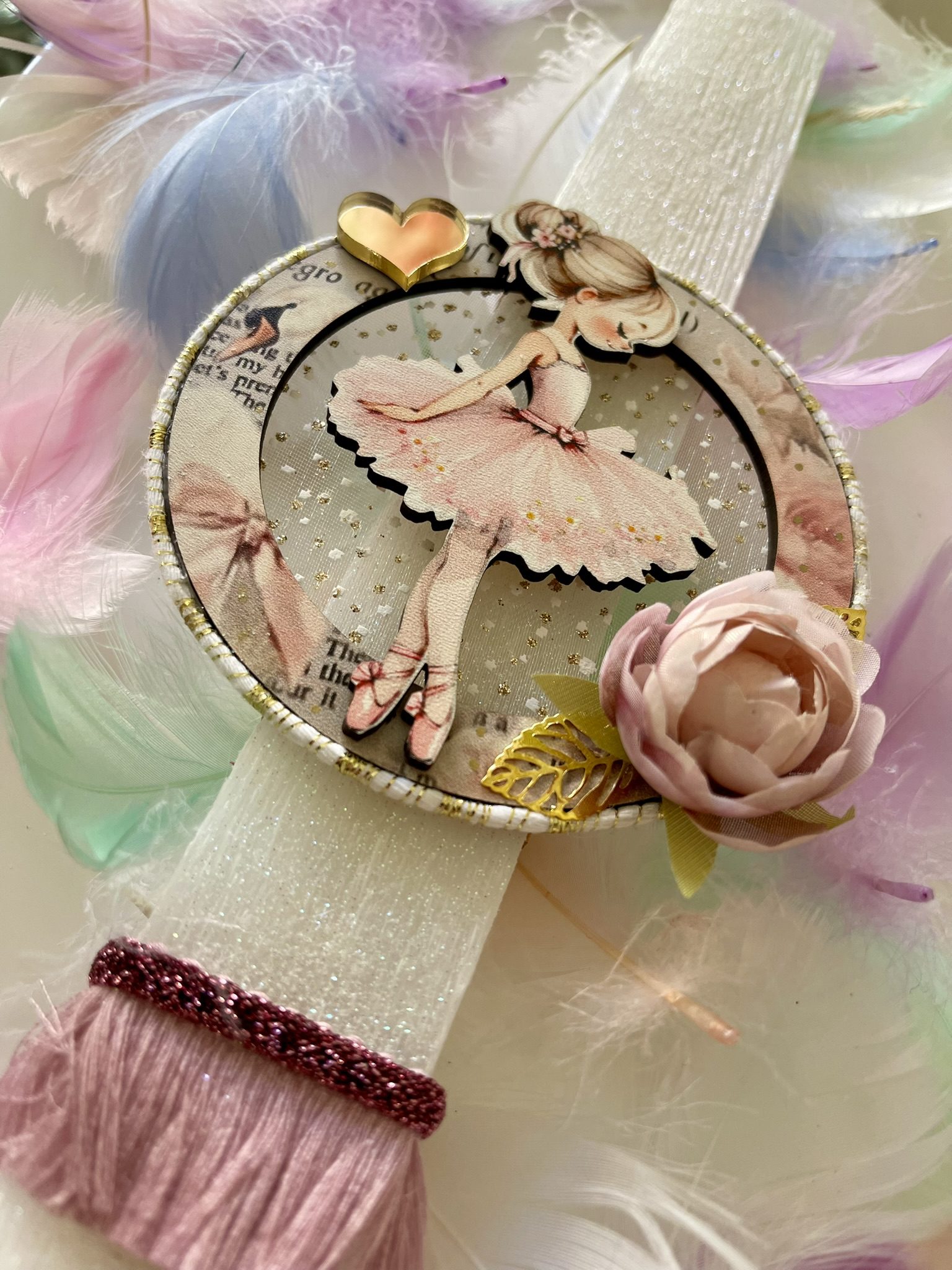 Χειροποίητη πασχαλινή αρωματική λαμπάδα με πλακέ κερί”Μπαλαρίνα” σε αποχρώσεις off white ,ροζ,σάπιο μήλο , χρυσές λεπτομέρειες και glitter .