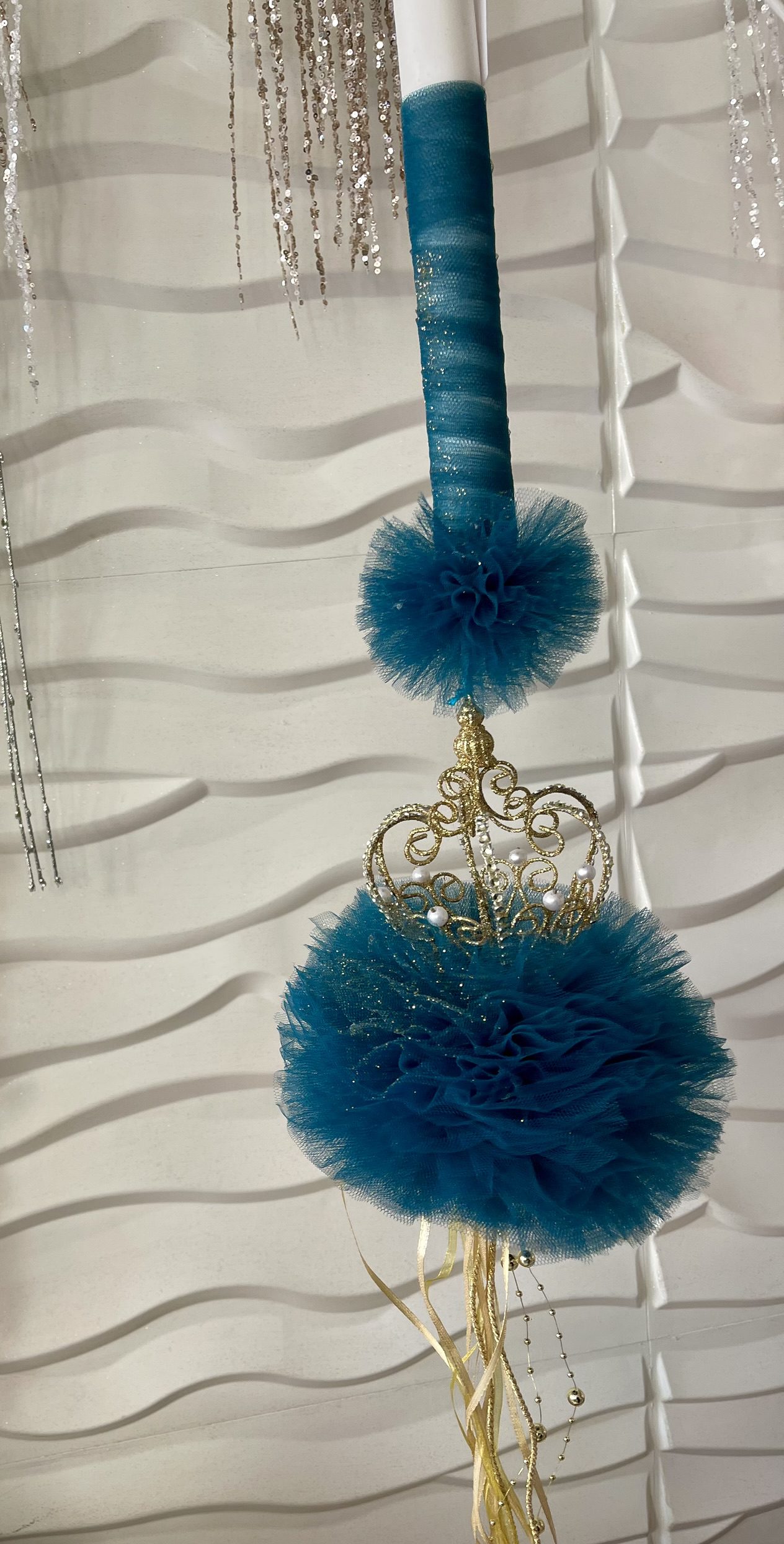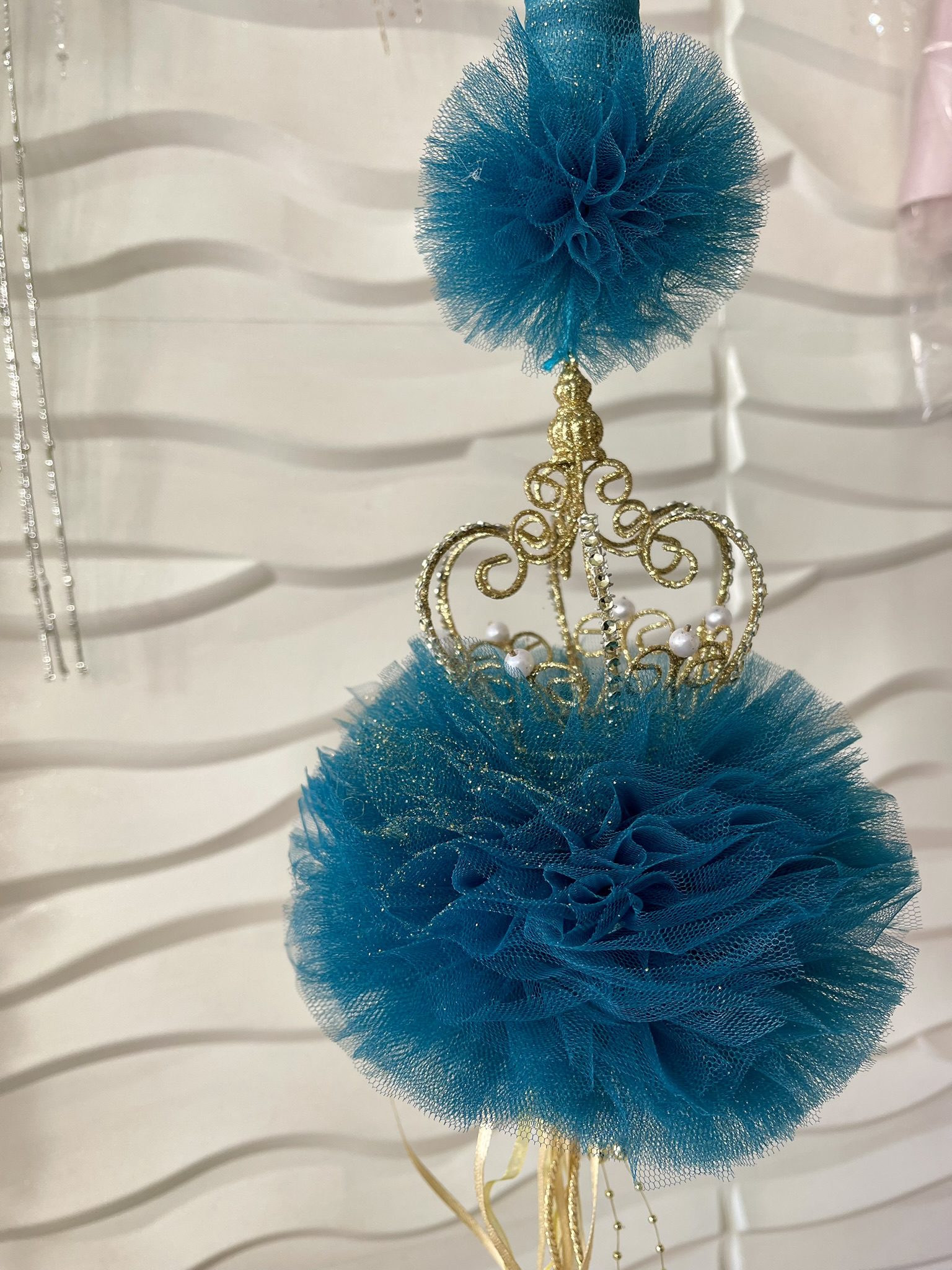 μεγάλο πον-πον στο ίδιο χρώμα και εντυπωσιακή χρυσή κορώνα με πέρλες -glitter-strass