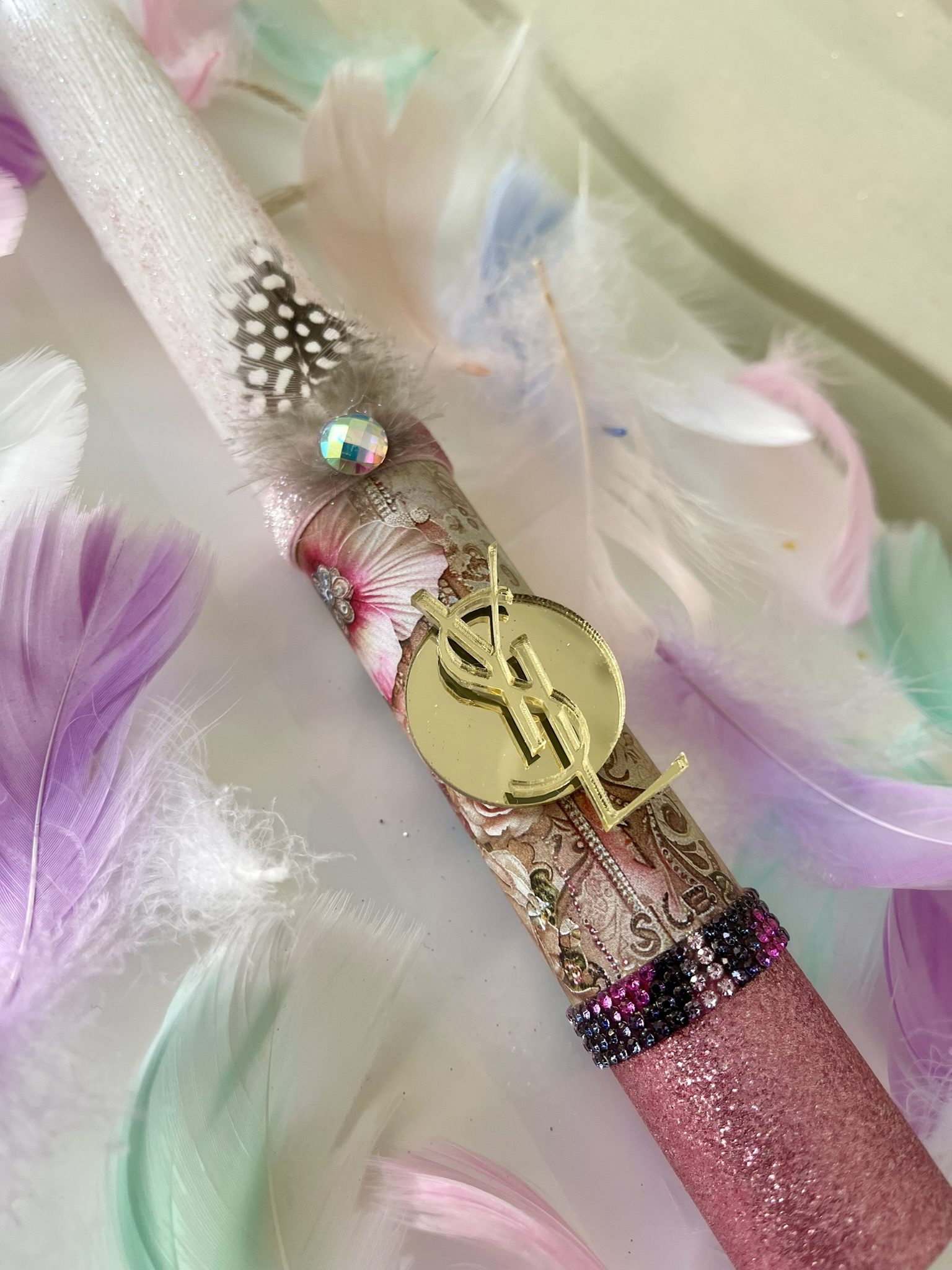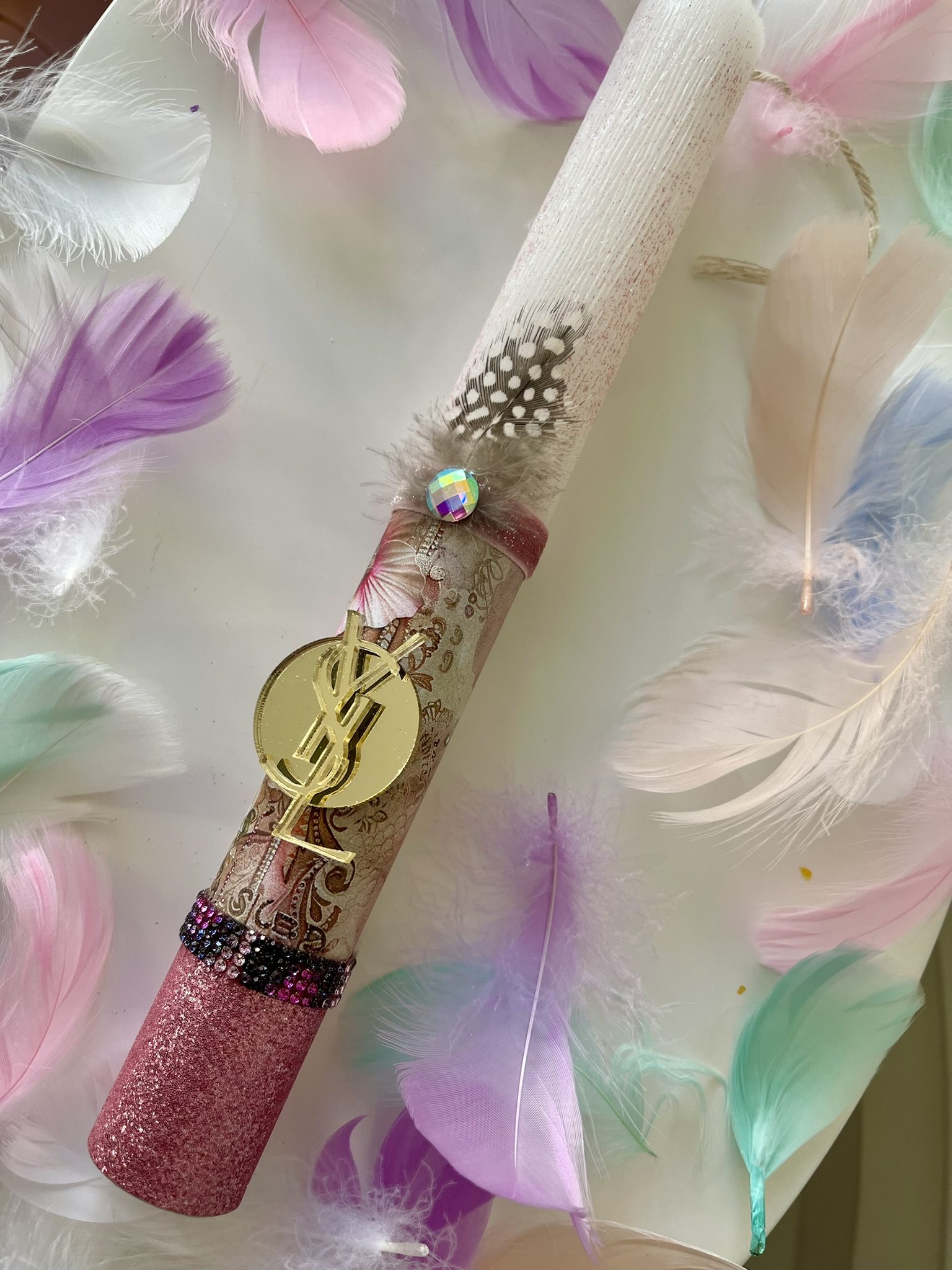 Χειροποίητη πασχαλινή αρωματική λαμπάδα τύπου ”YSL” σε off white απόχρωση με glitter ,strass,φτερά και κρύσταλλο .