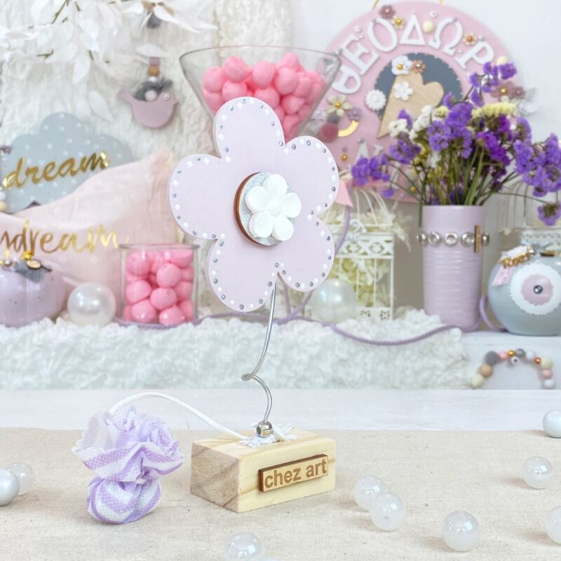 Ξύλινο διακοσμητικό επιτραπέζιο, σε λιλά ασημί αποχρώσεις, με θέμα λουλούδι.