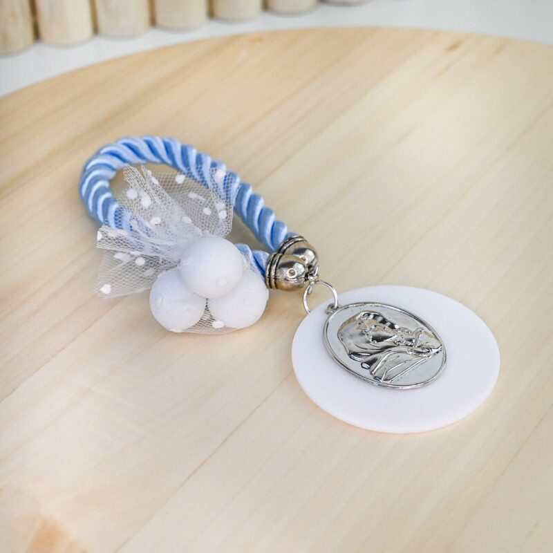 Μπομπονιέρα luckycharm με plexiglass white εκκρεμές μοτίφ και θέμα εικόνα, σε κορδόνι rayon σιέλ απόχρωσης υψηλής ποιότητας.