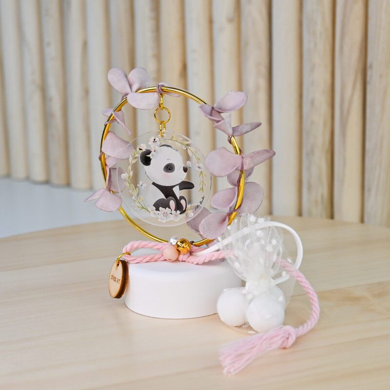 Διακοσμητικό στρογγυλό διάφανο plexiglass μοτίφ εκκρεμές, σε απαλές αποχρώσεις, με θέμα panda.