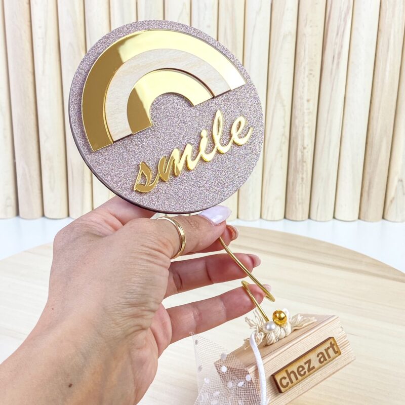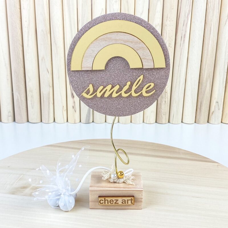Ξύλινο διακοσμητικό επιτραπέζιο, σε ροζ και χρυσές αποχρώσεις, με θέμα ουράνιο τόξο.