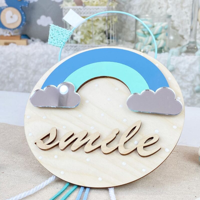 Ξύλινο διακοσμητικό γούρι, σε μπλε, ασημί αποχρώσεις, με θέμα ουράνιο τόξο.