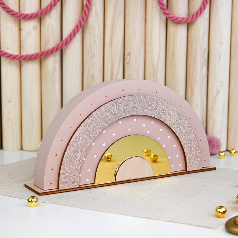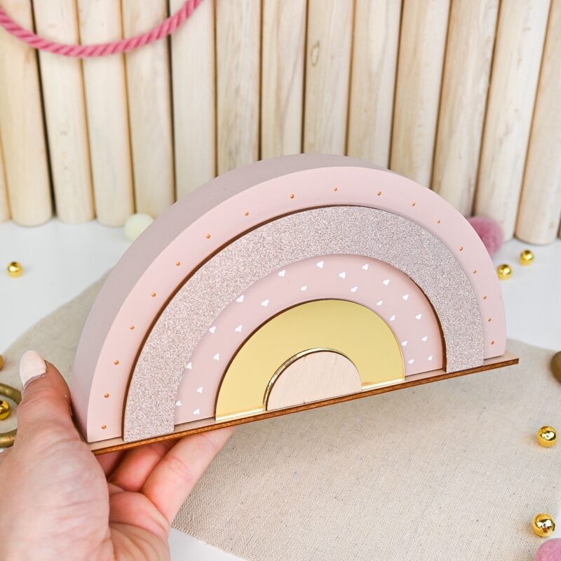 Ξύλινο μασίφ επιτραπέζια πλακέτα με θέμα ουράνιο τόξο, σε χαρούμενες αποχρώσεις.