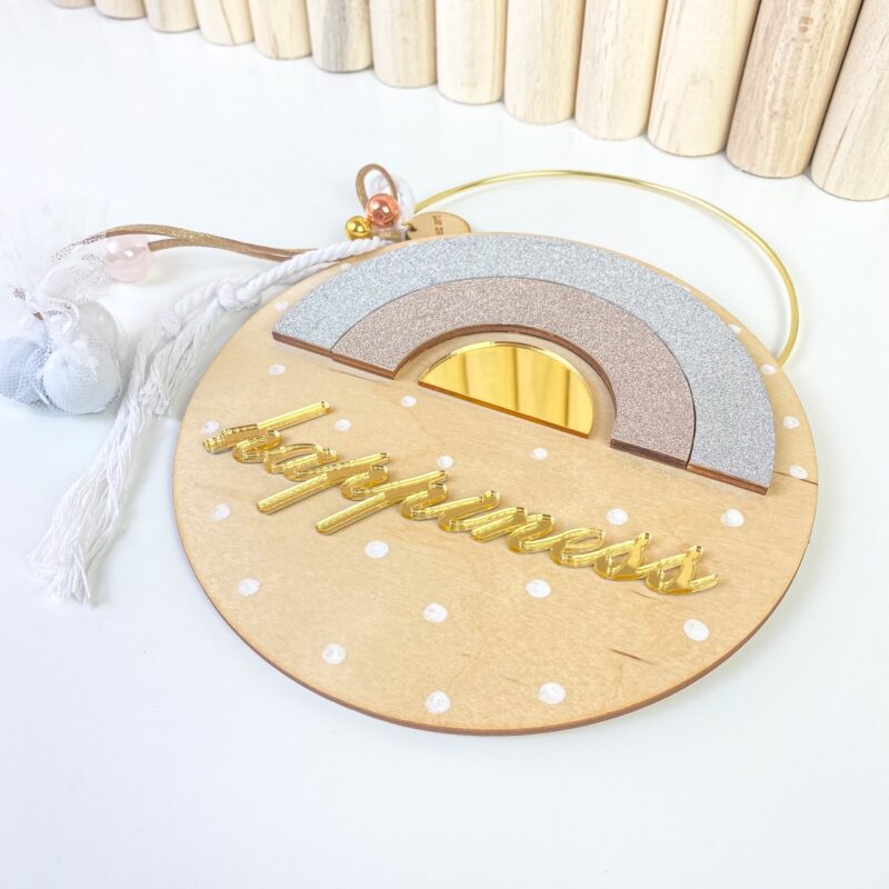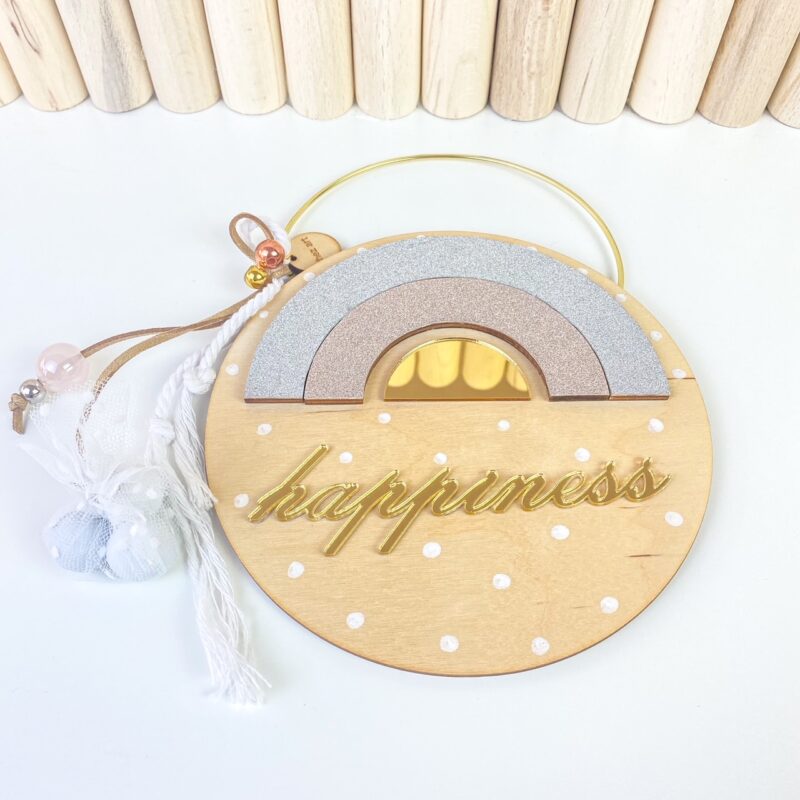 Ξύλινο διακοσμητικό γούρι, σε ροζ, ασημί και χρυσό αποχρώσεις, με θέμα ουράνιο τόξο.
