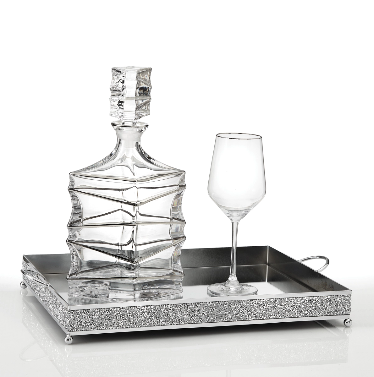 Ορθογώνιο ασημένιο δίσκο με καθρέπτη, ασημένιο φινίρισμα και περίγραμμα από ασημένια στρασάκια, διαστάσεων (40x30x7cm).