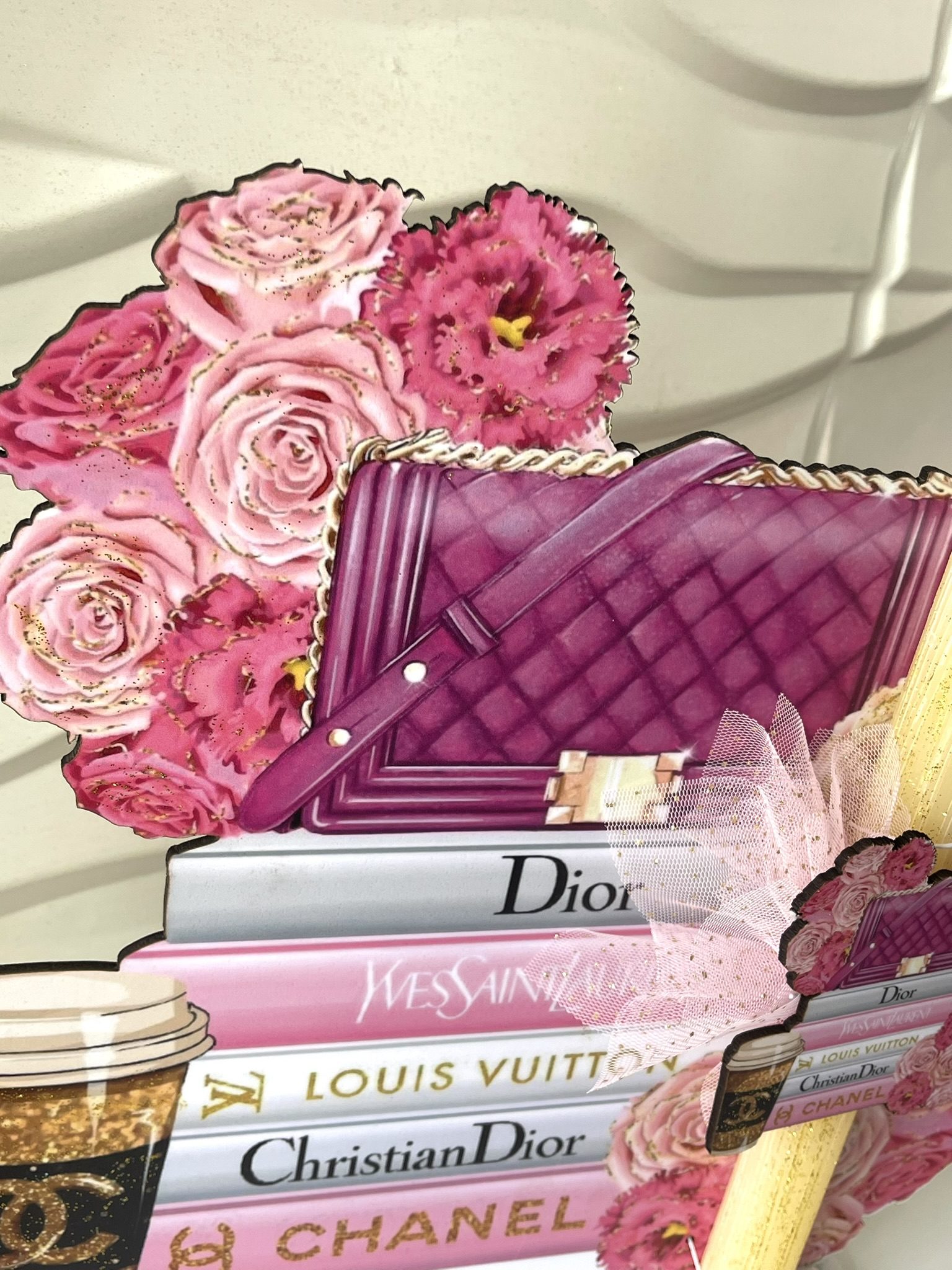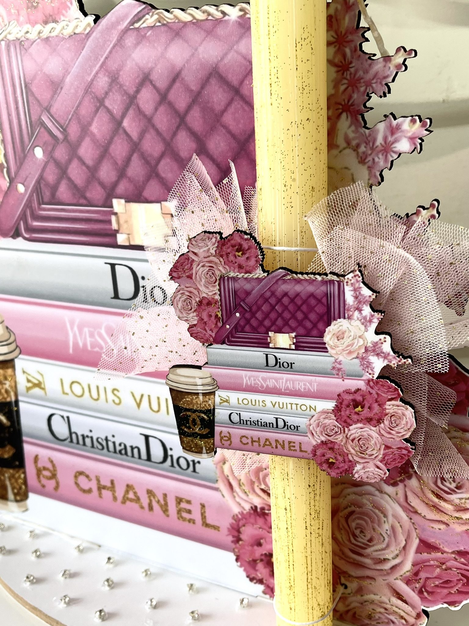 Xειροποίητη πασχαλινή αρωματική λαμπάδα ”Dior,chanel,loui vouiton ” με strass, ξυλινη φιγούρα στοιχείο με ασορτί ξύλινη φιγούρα stand .