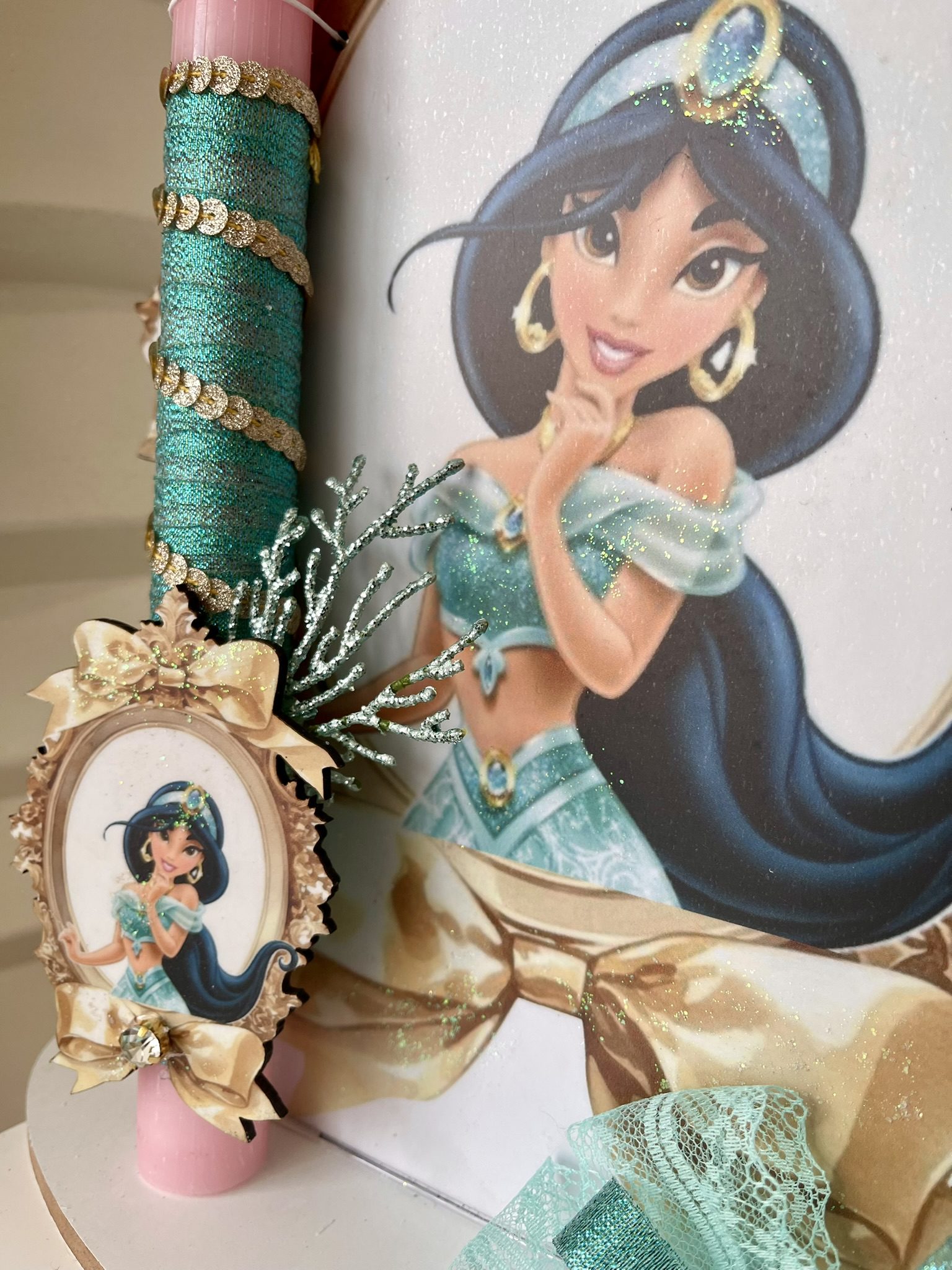 Xειροποίητη πασχαλινή αρωματική λαμπάδα ”Γιασμίν” Disney με strass, ξυλινη φιγούρα στοιχείο με ασορτί ξύλινη φιγούρα stand .