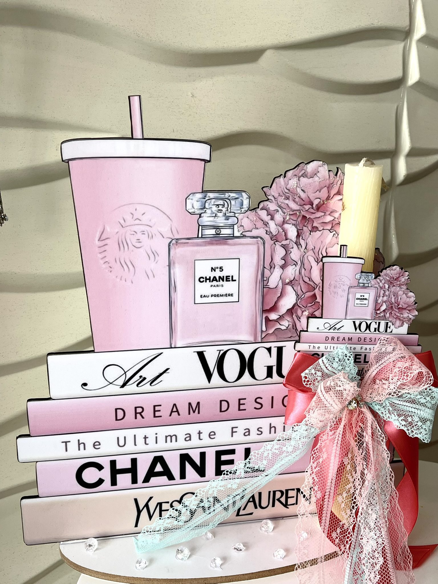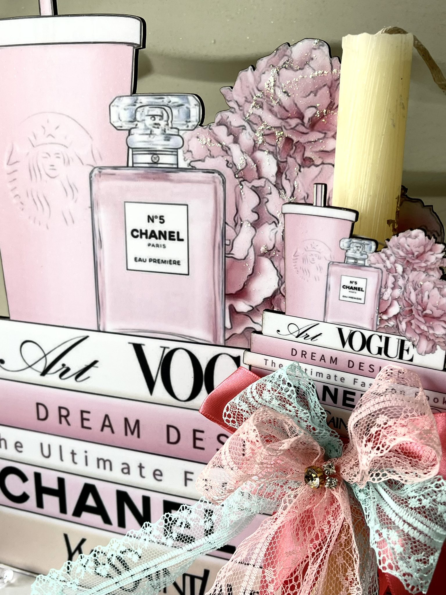 Xειροποίητη πασχαλινή αρωματική λαμπάδα ”Dior,chanel” με strass, ξυλινη φιγούρα στοιχείο με ασορτί ξύλινη φιγούρα stand .