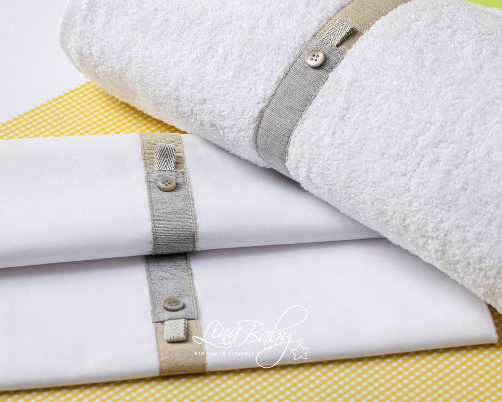 Μοντέρνο βαμβακερό σετ λαδόπανων σε λευκό, με κομψές τρέσες σε μπεζ & γκρι αποχρώσεις και δίχρωμα κουμπάκια που προσθέτουν χαρακτήρα στο design.