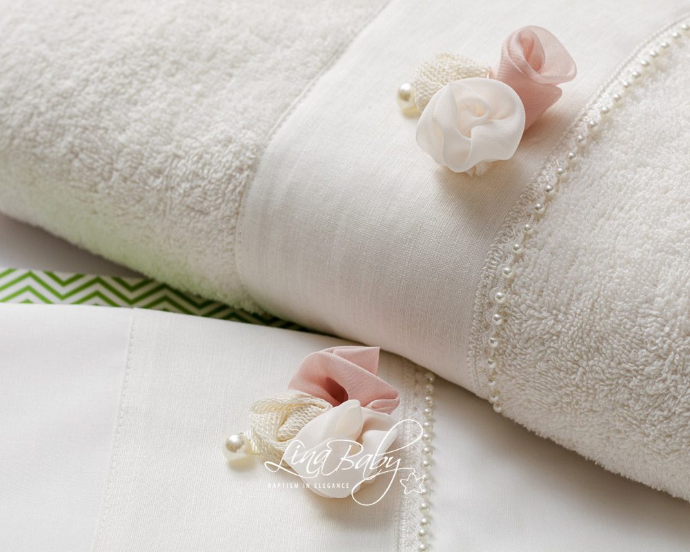 Εκλεπτυσμένο βαμβακερό σετ λαδόπανων σε φίνο εκρού, διακοσμημένο με λινή φάσα υψηλής ποιότητας, αριστοκρατική τρέσα με πέρλες και χειροποίητα υφασμάτινα λουλούδια σε αποχρώσεις σάπιο μήλο, εκρού και μπεζ.