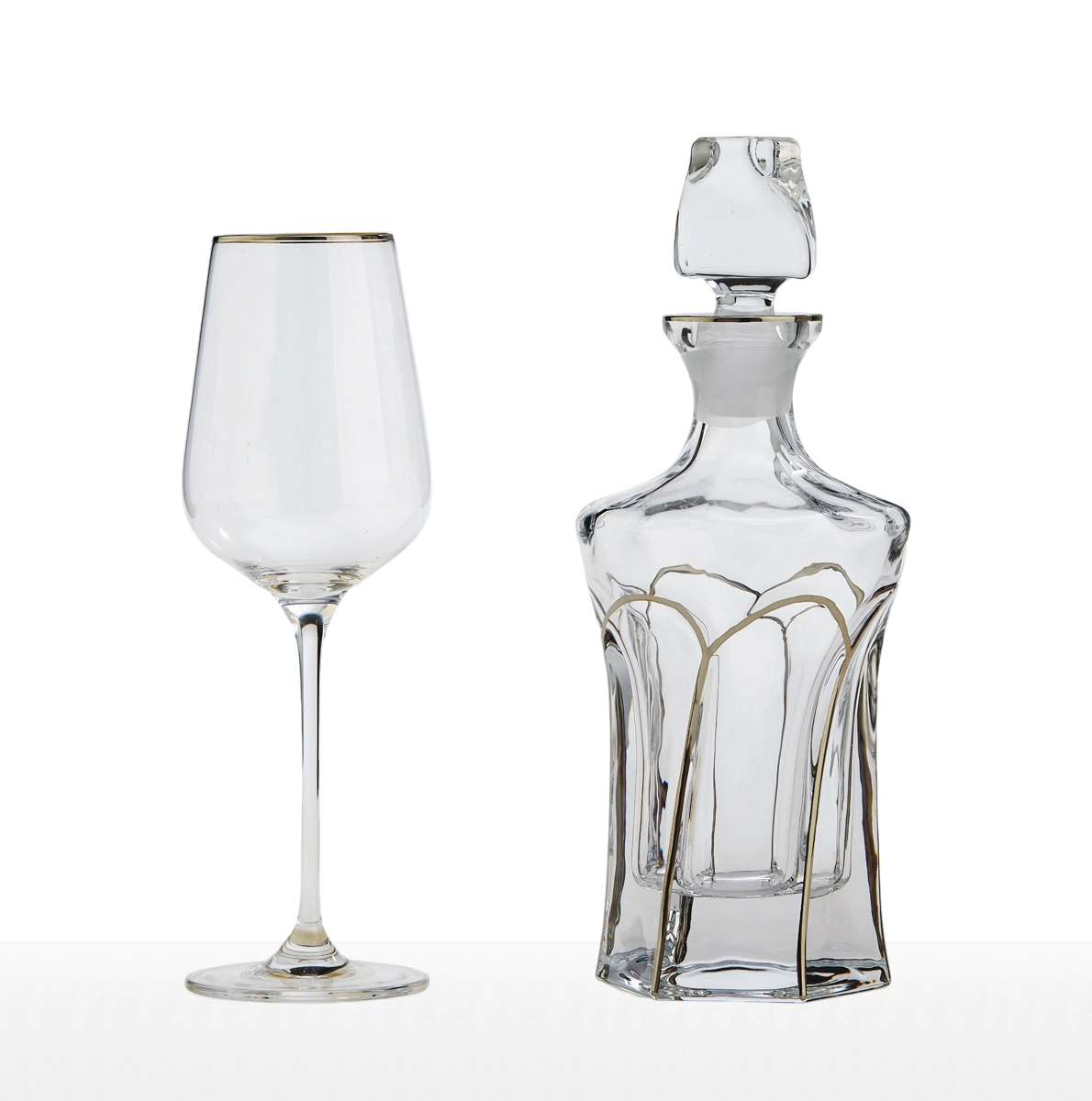 Σετ ποτηριού και καράφας γάμου από κρύσταλλο με χρυσή ή ασημένια λεπτομέρεια.
