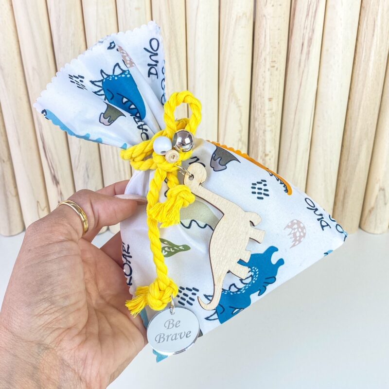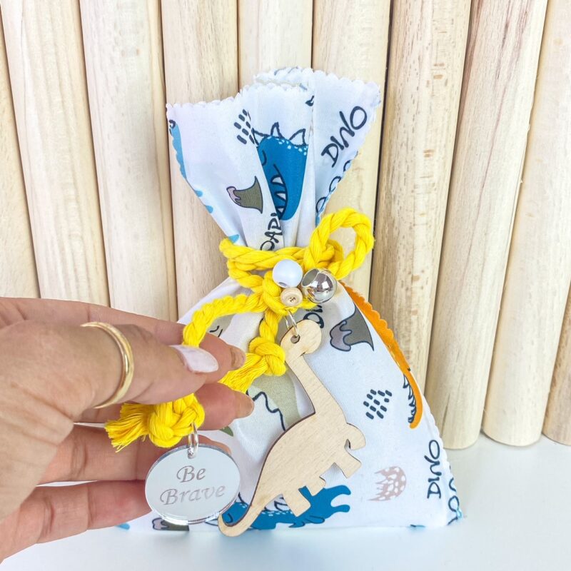 Υφασμάτινο πουγκί με ιδιαίτερο print με θέμα δεινόσαυρος, σε μπλε, κίτρινες και ασημί αποχρώσεις, με θέμα δεινοσαυράκι.