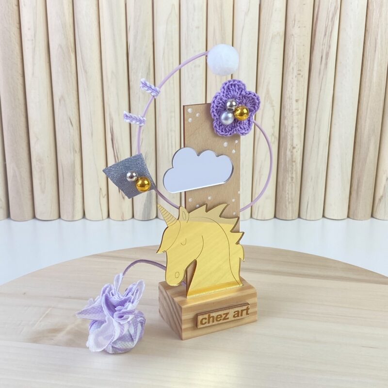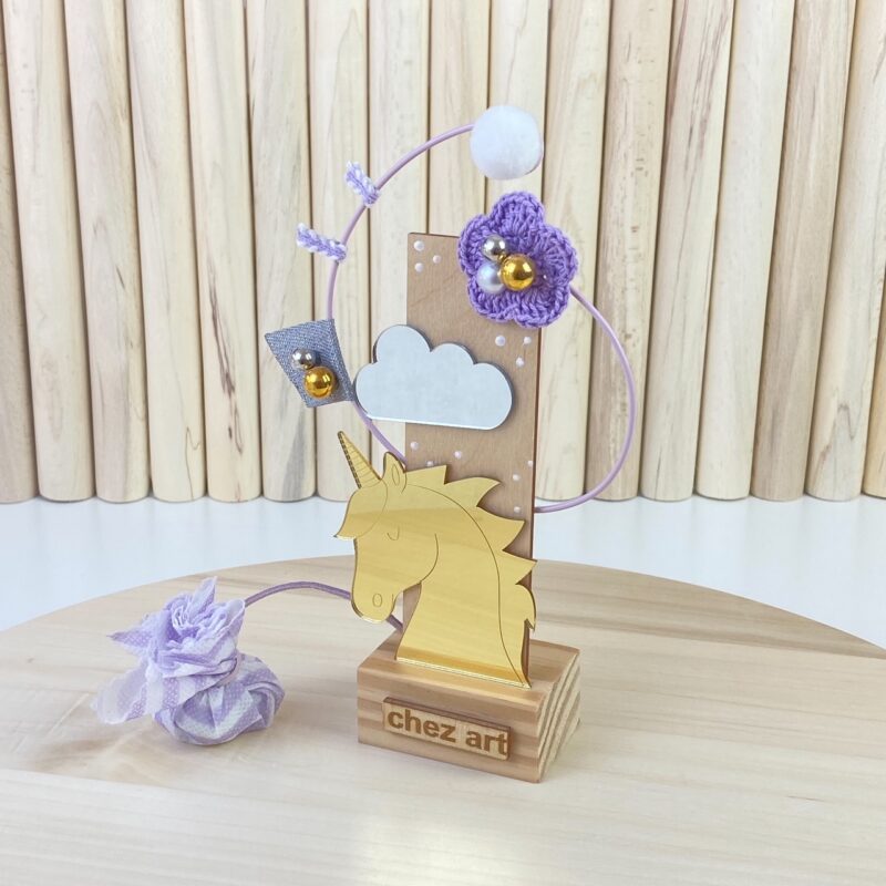 Ξύλινο διακοσμητικό επιτραπέζιο, σε lilac, χρυσό και ασημί αποχρώσεις, με θέμα μονόκερος.