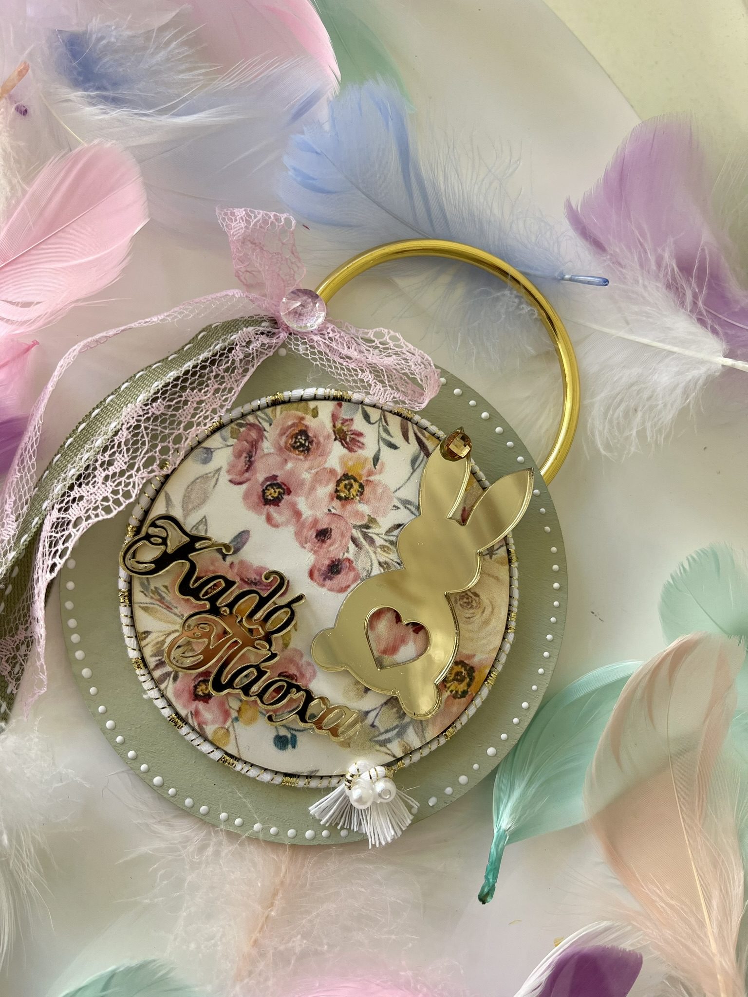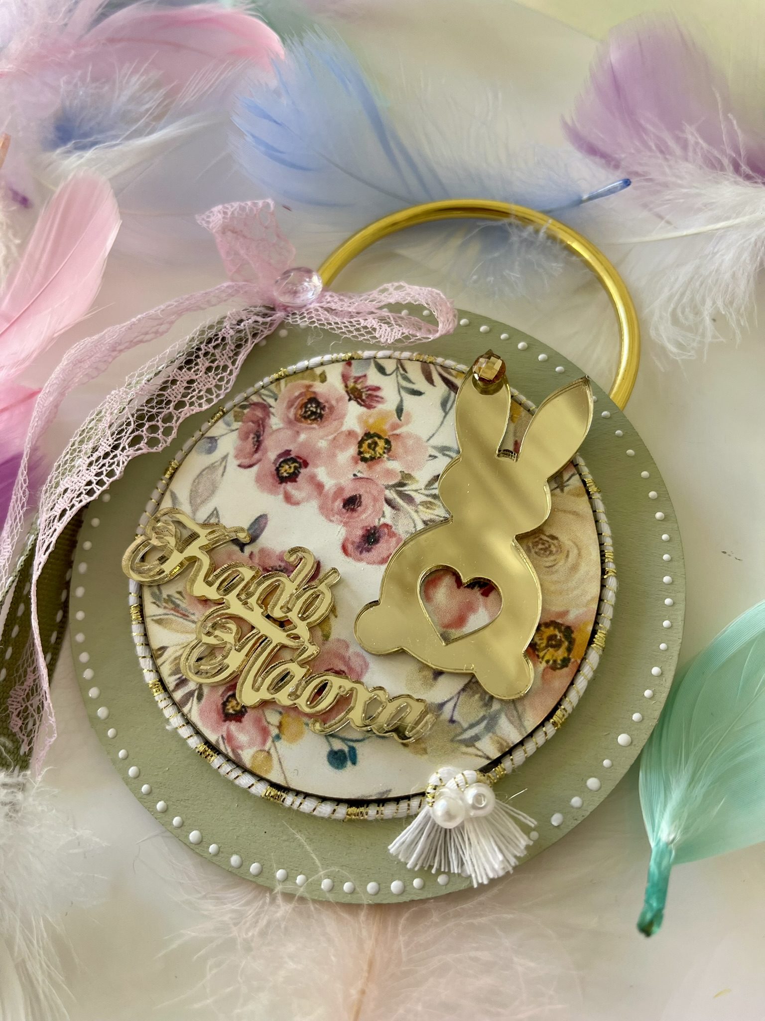 Ξύλινο διακοσμητικό ανοιξιάτικο-πασχαλινό γούρι με plexiglass χρυσό λαγουδάκι ,floral διακόσμηση σε λαδί φόντο